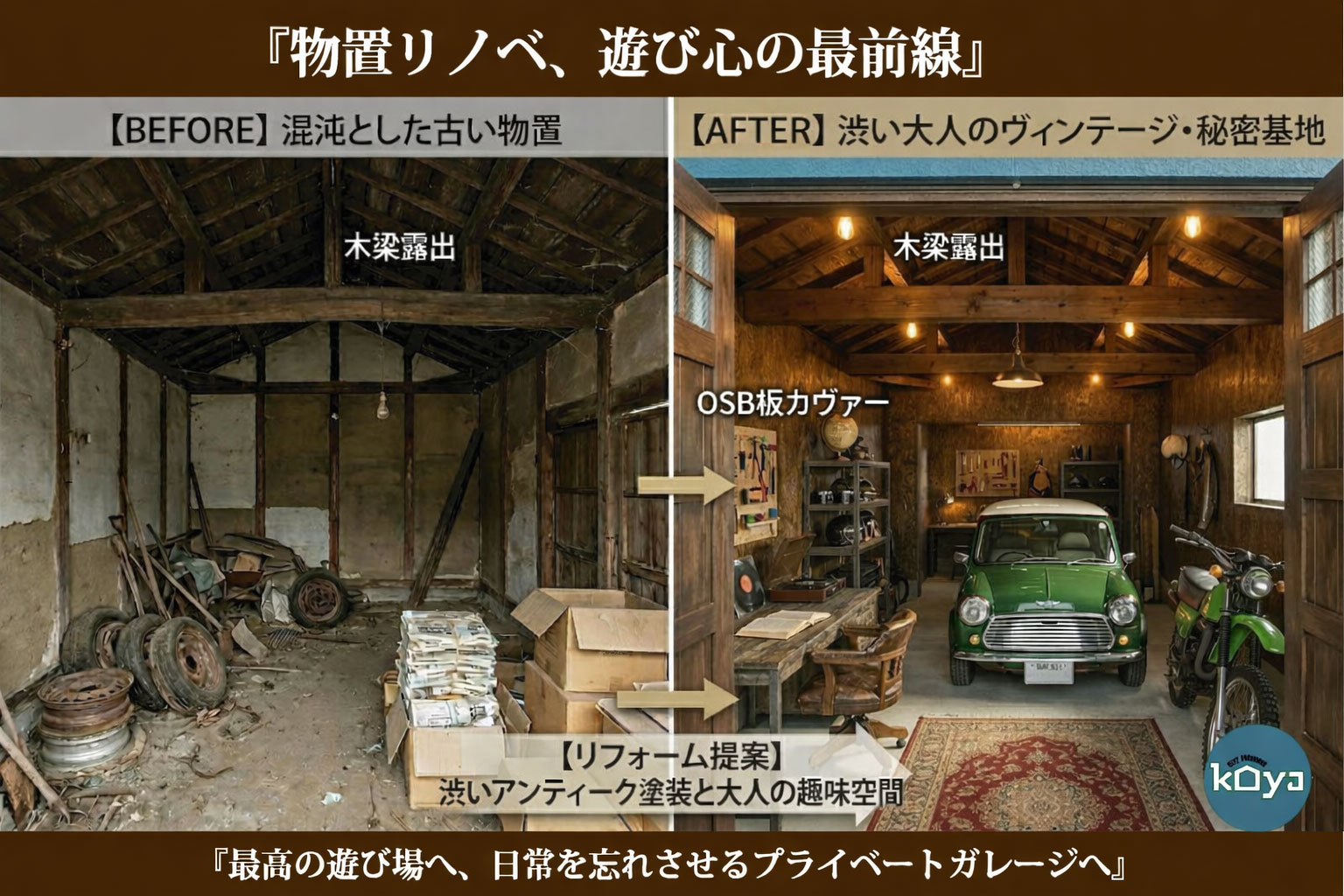 福岡市近郊の古い住宅や、倉庫・物置などが、日常を忘れさせるプライベートガレージに変身!